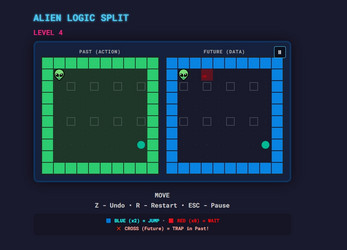 An experiment gone wrong has split your existence across two timelines. Your body is trapped in the Ancient Jungle (Past), while your consciousness wanders the Cyber Ruins (Future).