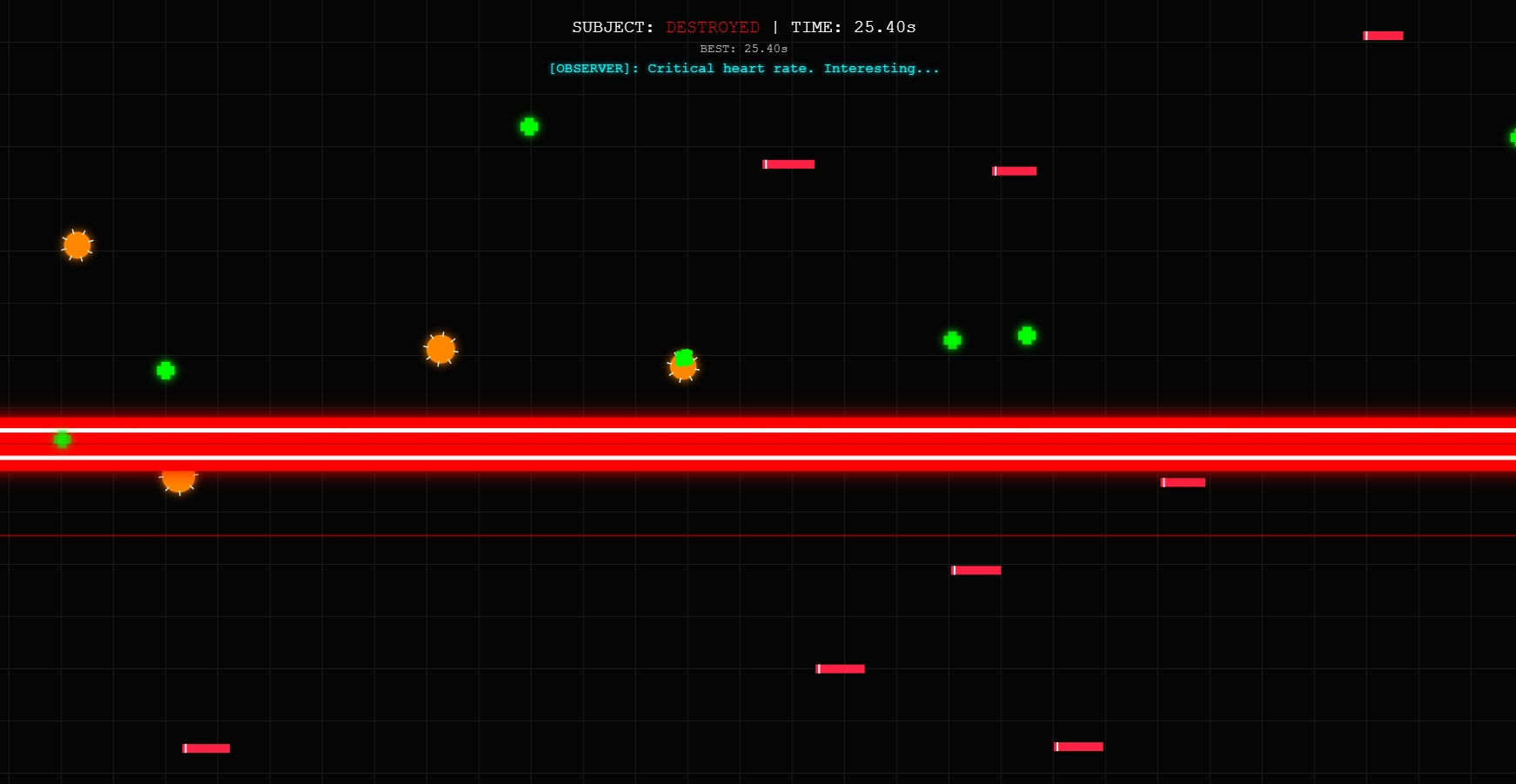 You are unstable biological specimen #843. Cleaning protocols actived. Your goal is to survive as long as possible while dodging security systems, lasers, and "Hunters".